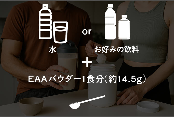 水またはお好みの飲料350~600ml※に、EAAパウダー1食分(約14.5g)※をシェイカーボトルで溶かすのが基本です。