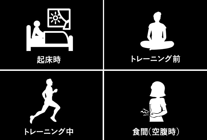 - 起床時:就寝中は栄養補給が途絶え、血中アミノ酸濃度が低下し、筋肉の分解が進みやすい状態です。吸収の速いEAAをすぐに摂取することで、筋肉の分解を素早く抑制し、代謝を活性化します。